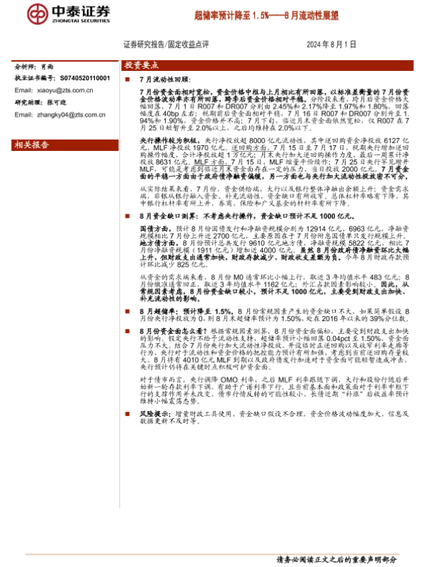 【中泰证券】【20240801】8月流动性展望:超储率预计降至1.5%-14页 行业研究
