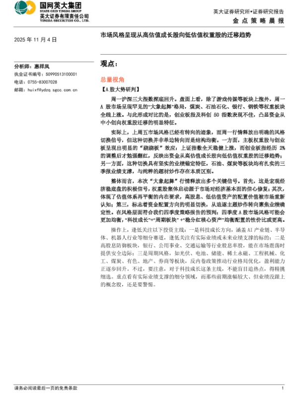 【英大证券】【202511】金点策略晨报:市场风格呈现从高估值成长股向低估值权重股的迁移趋势-4页 证券期货研究报告