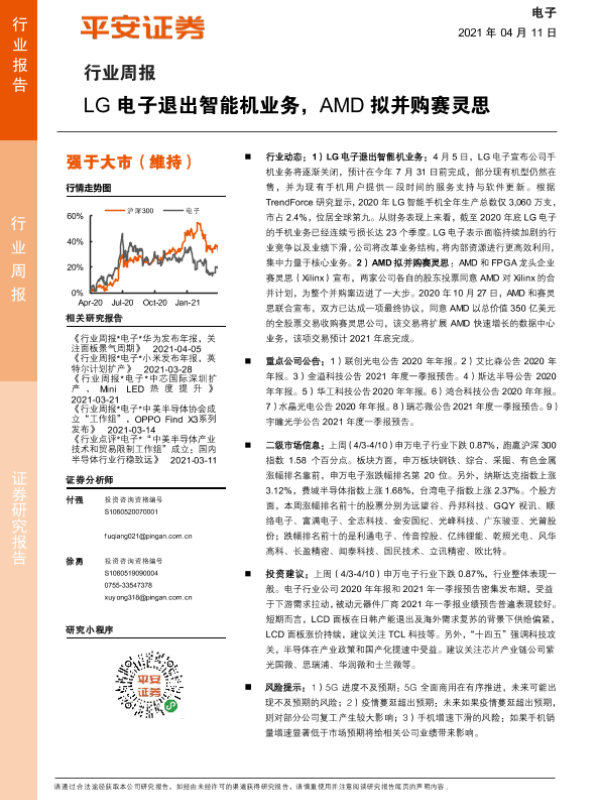 【平安证券】【20210411】20210411-平安证券-电子行业周报:LG电子退出智能机业务,AMD拟并购赛灵思-5页 行业研究