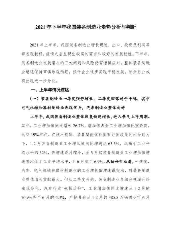 【尹训飞】【202107】2021年下半年我国装备制造业走势分析与判断-12页 行业研究