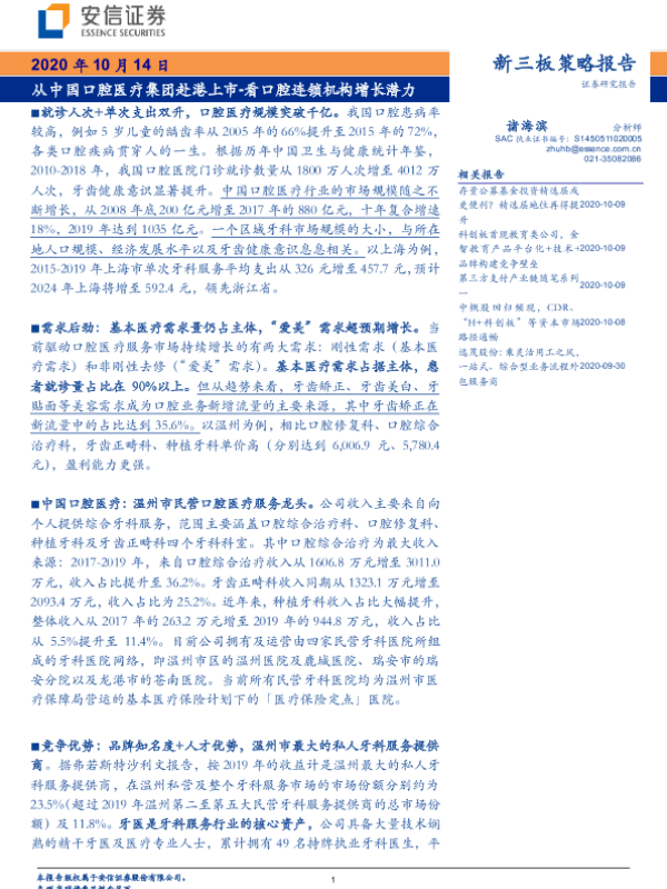 【安信证券】【20201014】从中国口腔医疗集团赴港上市,看口腔连锁机构增长潜力-25页 行业研究