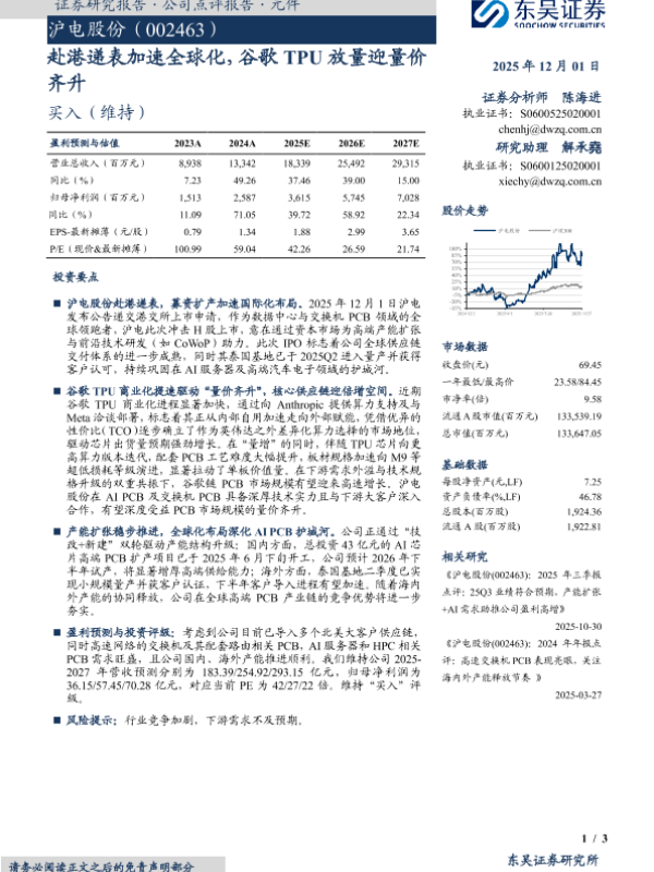 【东吴证券】【202512】沪电股份(002463):赴港递表加速全球化,谷歌 TPU放量迎量价齐升-3页 证券期货研究报告