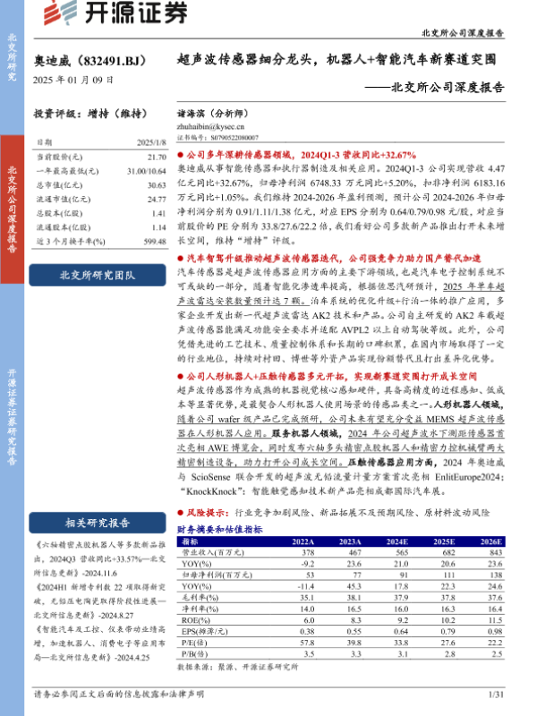 【开源证券】【20250109】奥迪威(832491)北交所公司深度报告:超声波传感器细分龙头,机器人+智能汽车新赛道突围-31页 行业研究