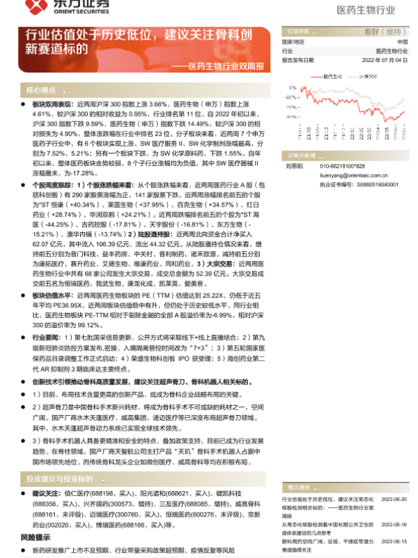 【东方证券】【20220704】医药生物行业双周报:行业估值处于历史低位,建议关注骨科创新赛道标的-16页 行业研究