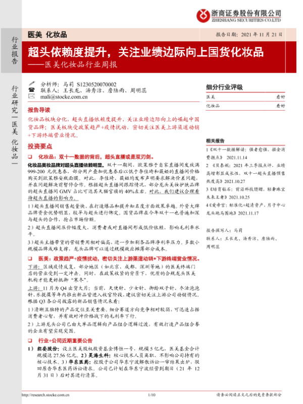 【浙商证券】【20211121】20211121-浙商证券-医美化妆品行业周报:超头依赖度提升,关注业绩边际向上国货化妆品-10页 行业研究