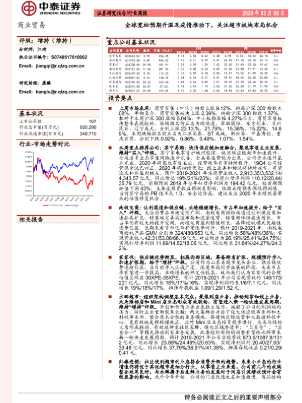 【中泰证券】【20200308】商业贸易行业周报:全球宽松预期升温及疫情推动下,关注超市板块布局机会-13页 行业研究