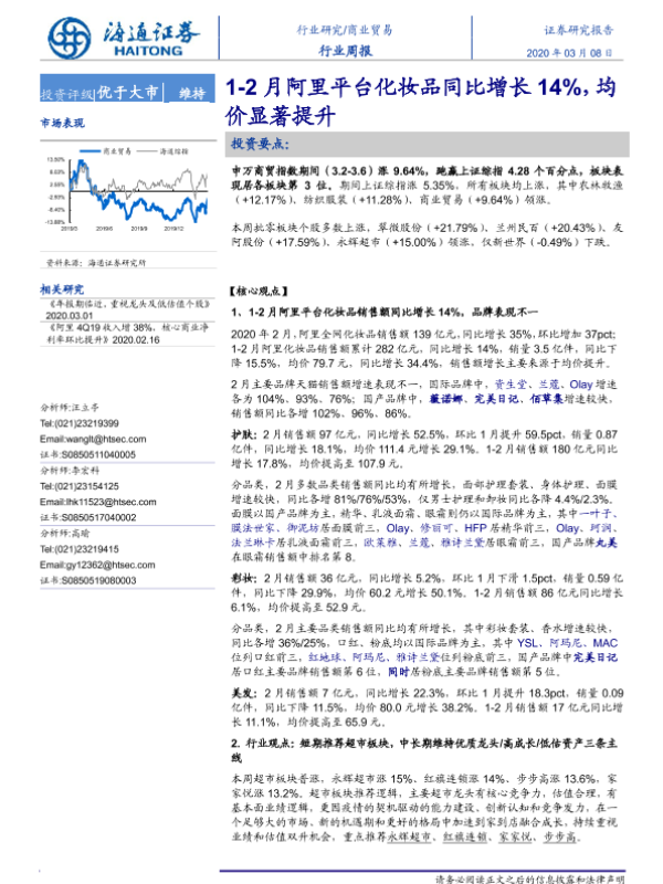 【海通证券】【20200308】商业贸易行业周报:1-2月阿里平台化妆品同比增长14%,均价显著提升-7页 行业研究