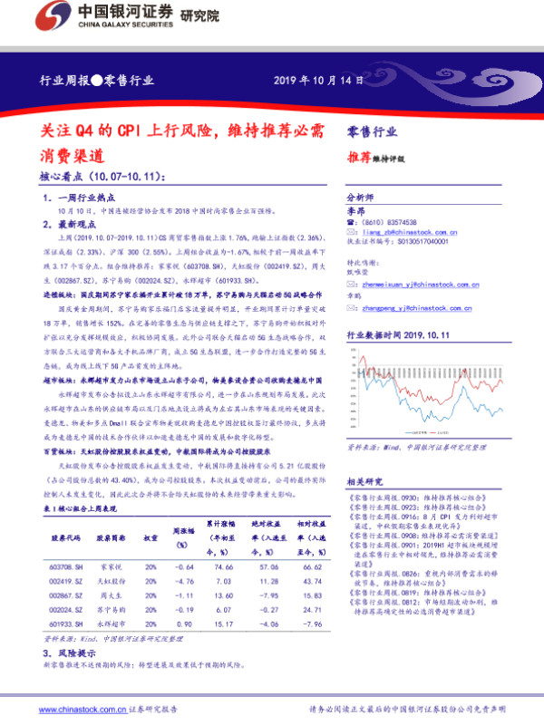 【银河证券】【20191014】零售行业周报:关注Q4的CPI上行风险,维持推荐必需消费渠道-30页 行业研究
