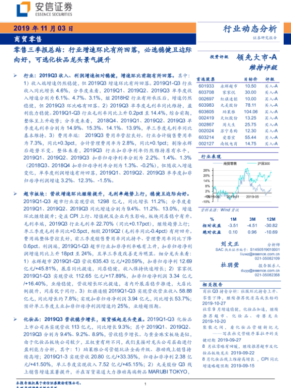【安信证券】【20191103】零售三季报总结:行业增速环比有所回落,必选稳健且边际向好,可选化妆品龙头景气提升-31页 行业研究