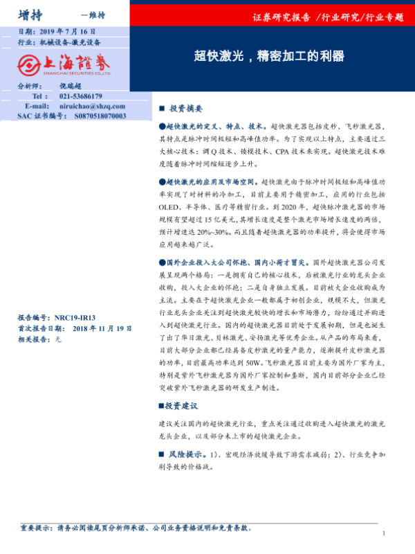 【上海证券】【20190716】超快激光,精密加工的利器-13页 行业研究