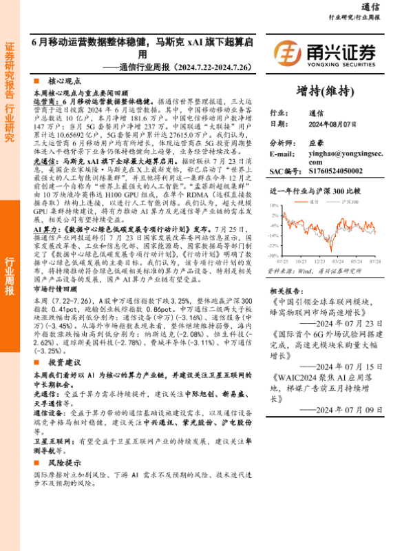 【甬兴证券】【20240807】20240807-甬兴证券-通信行业周报:6月移动运营数据整体稳健,马斯克xAI旗下超算启用-13页 行业研究