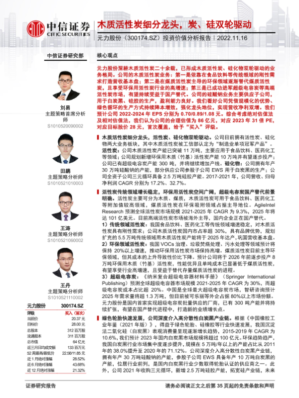 【中信证券】【20221116】20221116-中信证券-元力股份-300174-投资价值分析报告:木质活性炭细分龙头,炭、硅双轮驱动-36页 行业研究