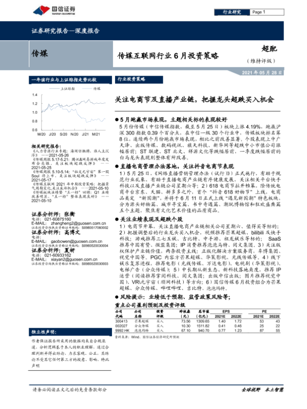 【国信证券】【20210528】传媒互联网行业6月投资策略:关注电商节及直播产业链,把握龙头超跌买入机会-10页 行业研究
