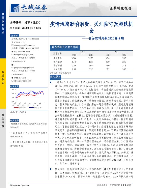 【长城证券】【20200203】食品饮料周报2020第4期:疫情短期影响消费,关注防守及超跌机会-11页 行业研究