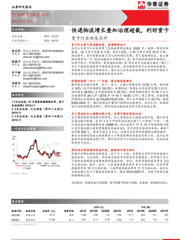 【华泰证券】【20191113】20191113-华泰证券-重卡行业动态点评:快递物流增长叠加治理超载,利好重卡-3页 行业研究