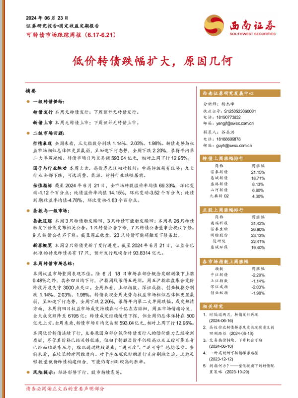 【西南证券】【20240623】可转债市场跟踪:低价转债跌幅扩大,原因几何-14页 行业研究