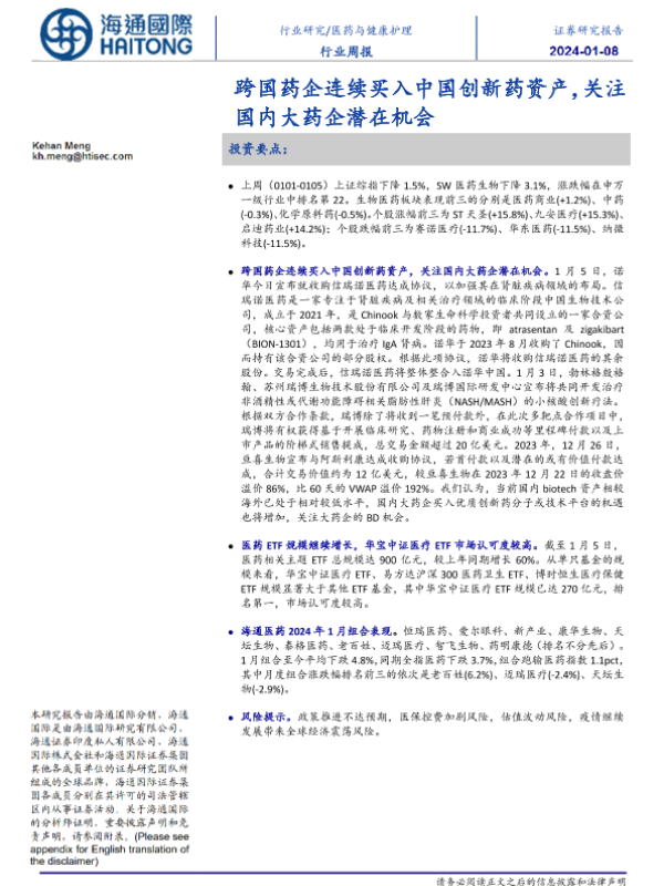 【海通国际】【20240108】医药与健康护理行业周报:跨国药企连续买入中国创新药资产,关注国内大药企潜在机会-12页 行业研究
