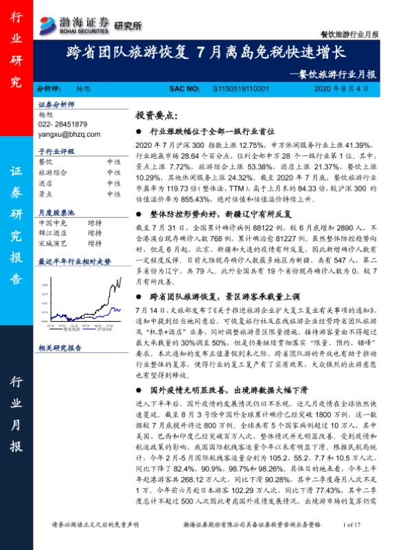 【渤海证券】【20200804】餐饮旅游行业月报:跨省团队旅游恢复 7月离岛免税快速增长-17页 行业研究
