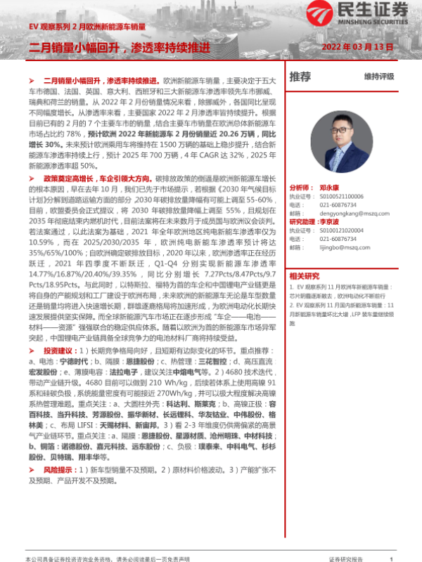 【民生证券】【20220313】2月欧洲新能源车销量:二月销量小幅回升,渗透率持续推进-19页 行业研究