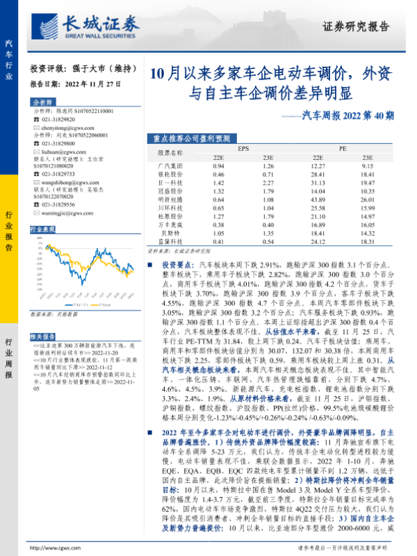 【长城证券】【20221127】汽车周报2022第40期:10月以来多家车企电动车调价,外资与自主车企调价差异明显-18页 行业研究