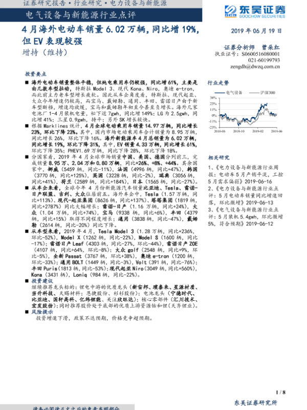 【东吴证券】【20190619】电气设备与新能源行业点评:4月海外电动车销量6.02万辆,同比增19%,但EV表现较强-8页 行业研究