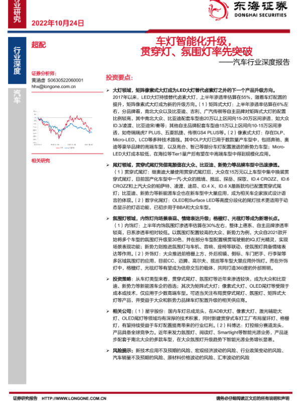 【东海证券】【20221024】车灯智能化升级,贯穿灯、氛围灯率先突破——汽车行业深度报告-26页 行业研究