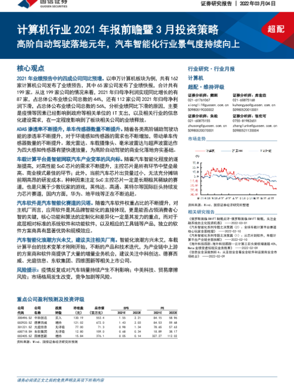 【国信证券】【20220304】计算机行业2021年报前瞻暨3月投资策略:高阶自动驾驶落地元年,汽车智能化行业景气度持续向上-17页 行业研究