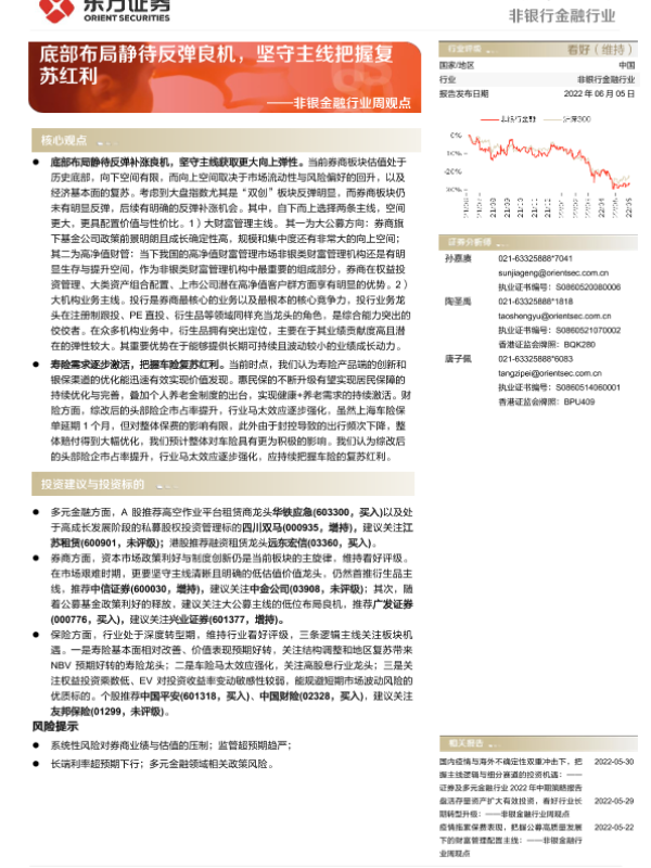 【东方证券】【20220605】非银金融行业周观点:底部布局静待反弹良机,坚守主线把握复苏红利-13页 行业研究