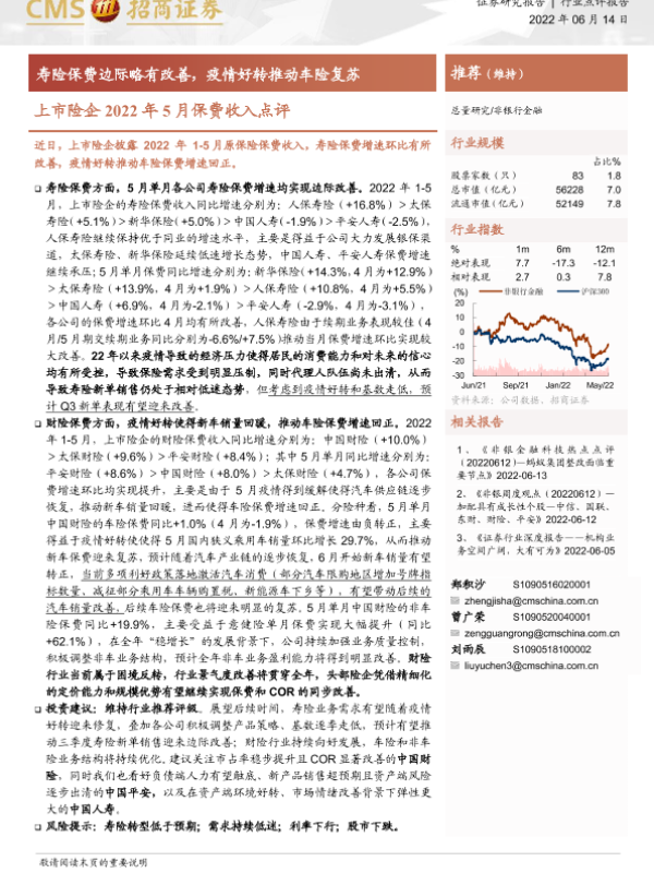 【海通证券】【20220614】上市险企2022年5月保费收入点评-3页 证券期货研究报告