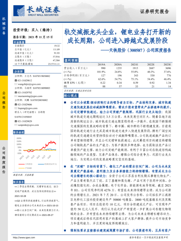 【长城证券】【20211115】20211115-长城证券-天铁股份-300587.SZ-公司深度报告:轨交减振龙头企业,锂电业务打开新的成长周期,公司进入跨越式发展阶段-34页 行业研究