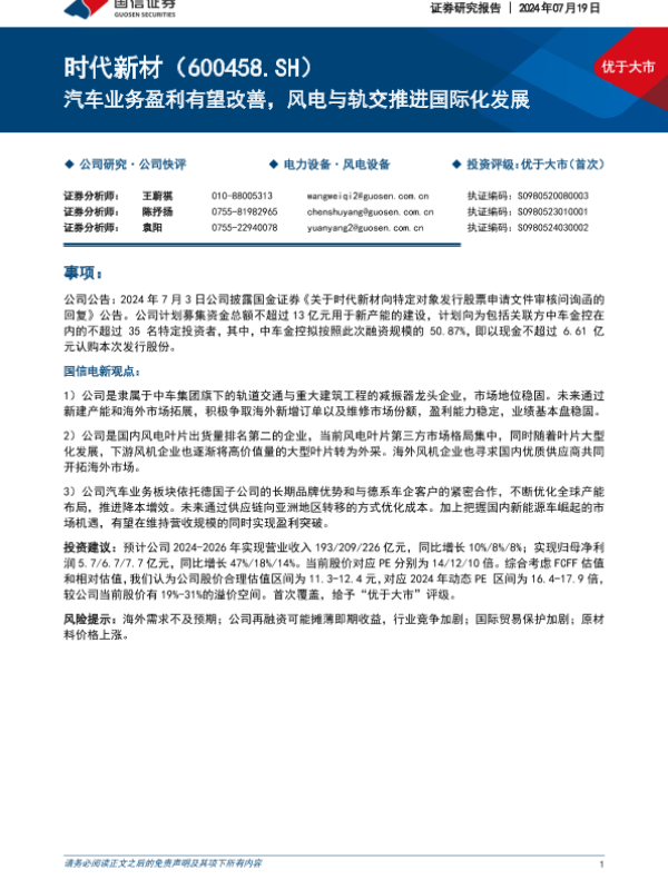 【国信证券】【20240719】时代新材(600458.SH)汽车业务盈利有望改善,风电与轨交推进国际化发展-22页 行业研究