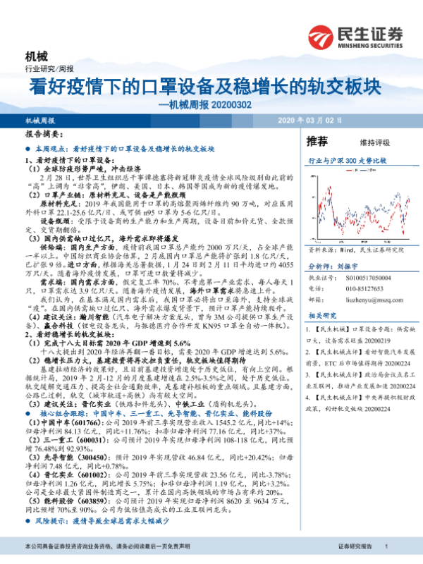【民生证券】【20200302】20200302-民生证券-机械周报:看好疫情下的口罩设备及稳增长的轨交板块-17页 行业研究