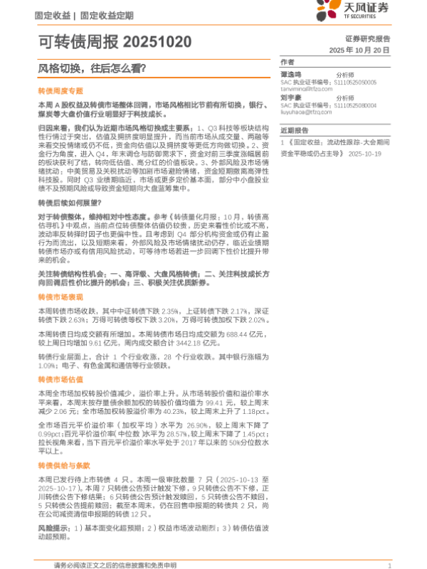 【天风证券】【202510】可转债周报 20251020-18页 证券期货研究报告