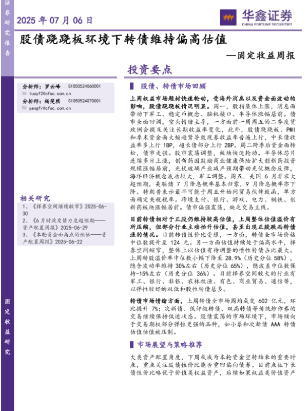 【华鑫证券】【20250706】股债跷跷板环境下转债维持偏高估值-10页 证券期货研究报告