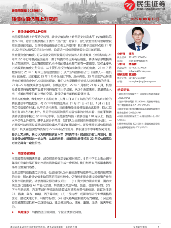 【民生证券】【20250810】转债周策略:转债估值仍有上升空间-13页 证券期货研究报告