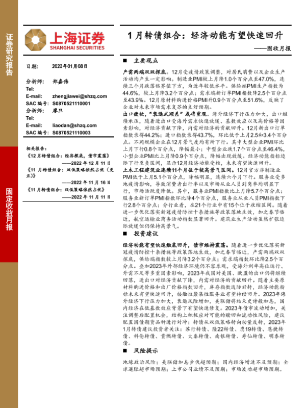 【上海证券】【20230108】固收月报:1月转债组合,经济动能有望快速回升-15页 行业研究