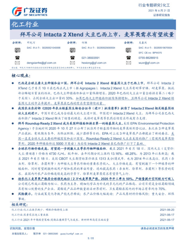 【广发证券】【20210621】拜耳公司Intacta 2 Xtend大豆巴西上市,麦草畏需求有望放量-11页 行业研究