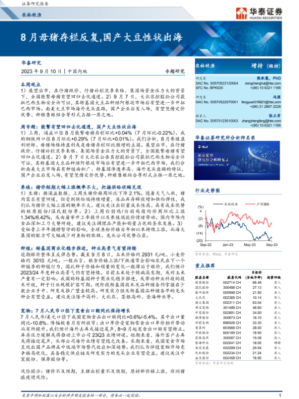 【华泰证券】【20230910】20230910-华泰证券-农林牧渔专题研究:8月母猪存栏反复,国产大豆性状出海-27页 行业研究
