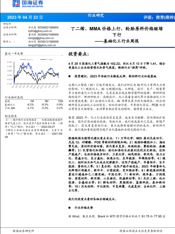 【国海证券】【20230423】基础化工行业周报:丁二烯、MMA价格上行,轮胎原料价格继续下行-56页 行业研究