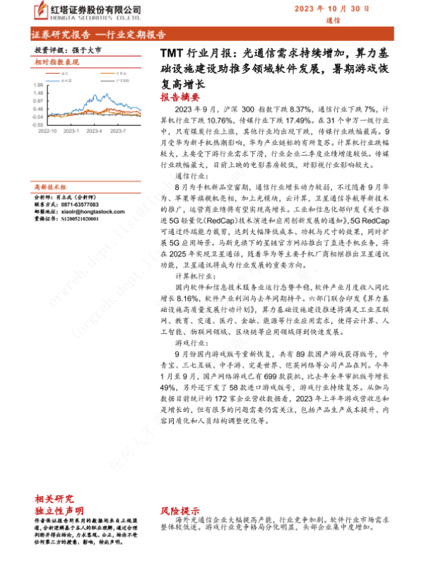 【红塔证券】【20231030】TMT行业月报:光通信需求持续增加,算力基础设施建设助推多领域软件发展,暑期游戏恢复高增长-14页 证券期货研究报告
