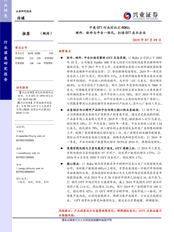 【兴业证券】【20190709】中美 OTT行业对比之 ROKU: 硬件、软件与平台一体化,打造 OTT龙头企业-31页 行业研究