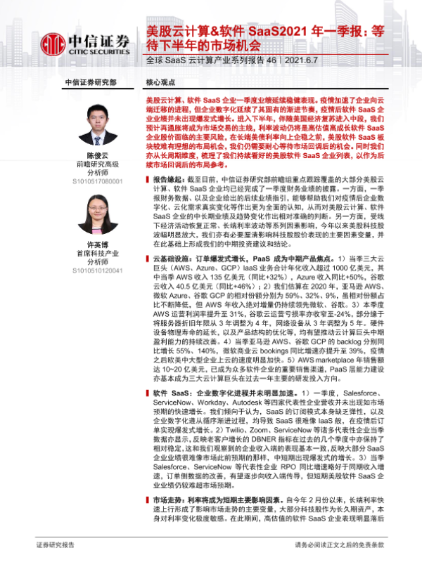【中信证券】【20210607】美股云计算&软件SaaS2021年一季报:等待下半年的市场机会-16页 行业研究