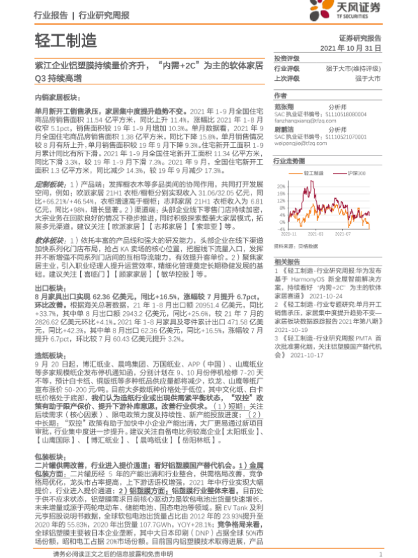 【天风证券】【20211031】20211031-天风证券-轻工制造行业研究周报:紫江企业铝塑膜持续量价齐升,“内需+2C”为主的软体家居Q3持续高增-23页 行业研究