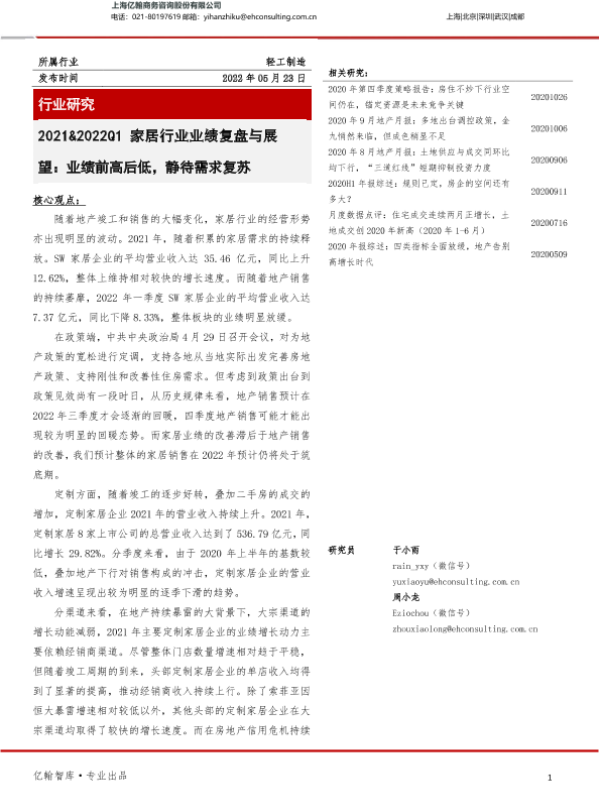 【上海亿翰商务咨询股份有限公司】【20220523】2021&2022Q1家居行业业绩复盘与展望:业绩前高后低,静待需求复苏-17页 行业研究