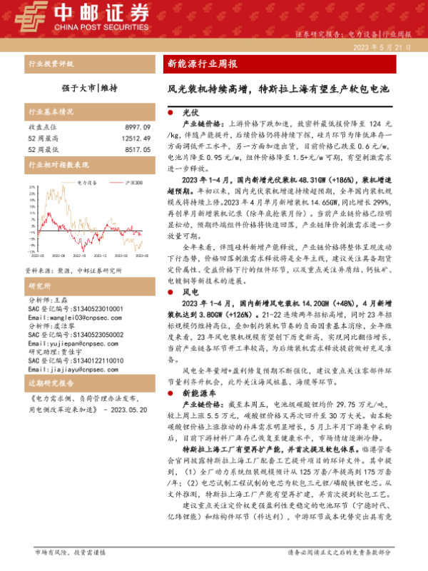 【中邮证券】【20230521】20230521-中邮证券-新能源行业周报:风光装机持续高增,特斯拉上海有望生产软包电池-19页 行业研究