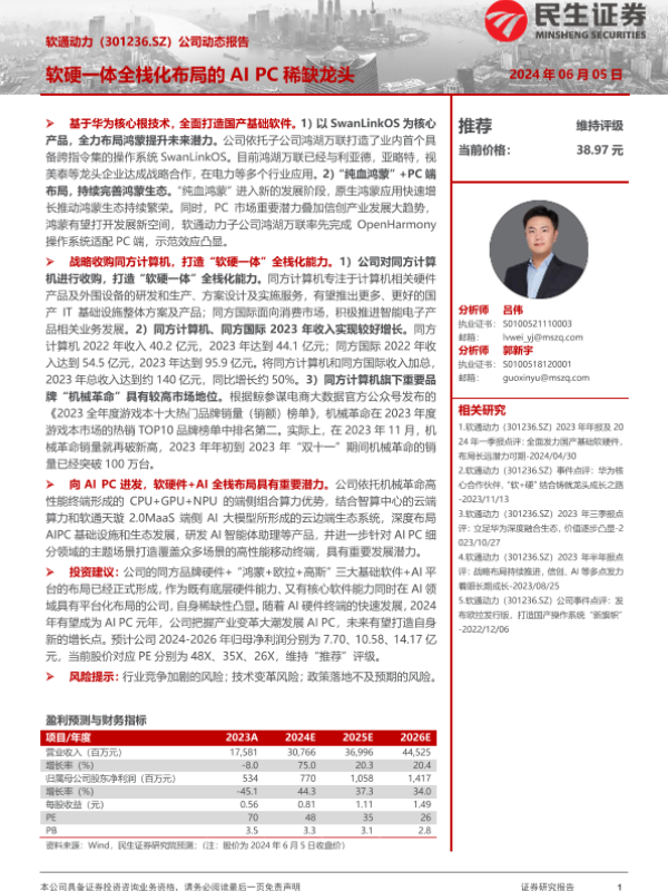 【民生证券】【20240605】软通动力(301236)公司动态报告:软硬一体全栈化布局的AI+PC稀缺龙头-17页 行业研究