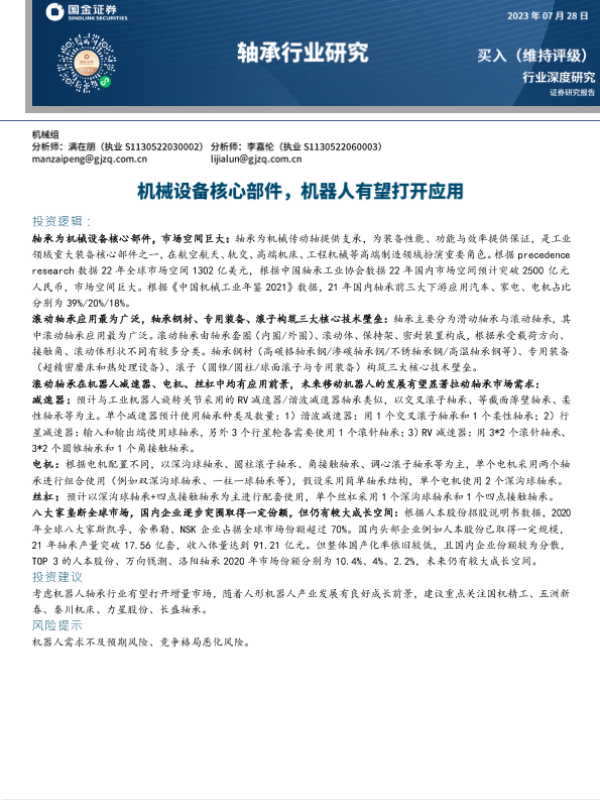 【国金证券】【20230731】2023-07-31-轴承行业研究-机械设备核心部件-机器人有望打开应用-52页 行业研究