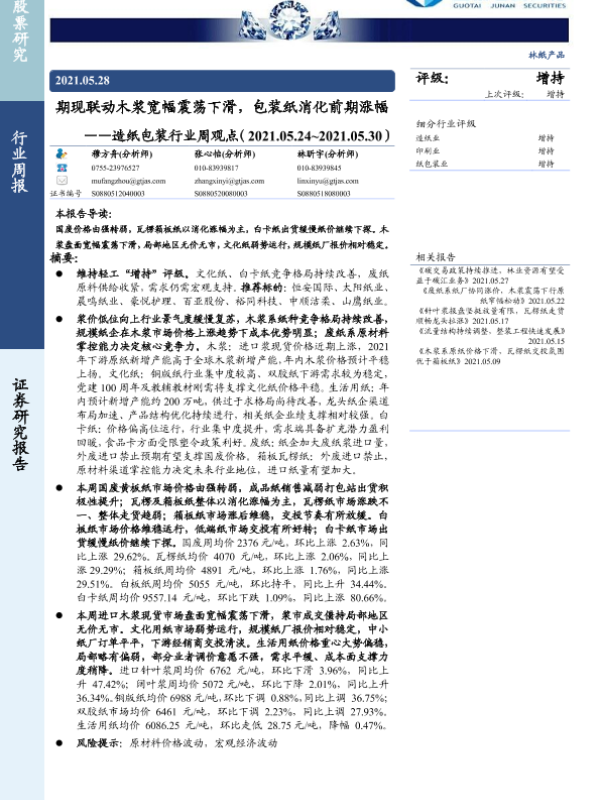 【国泰君安证券】【20210528】20210528-国泰君安-造纸包装行业周观点:期现联动木浆宽幅震荡下滑,包装纸消化前期涨幅-4页 行业研究