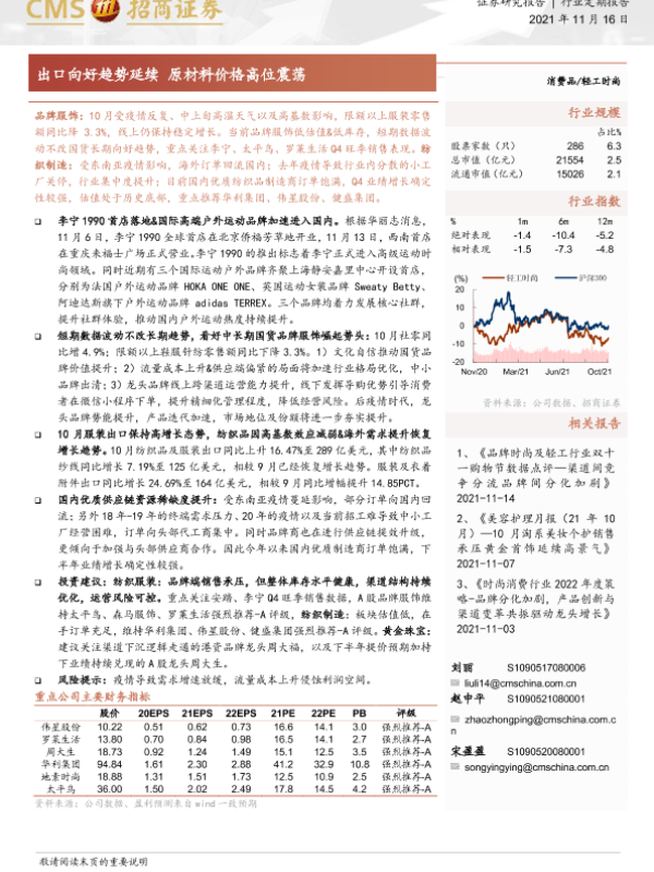 【海通证券】【20211116】轻工时尚行业:出口向好趋势延续 原材料价格高位震荡-9页 行业研究