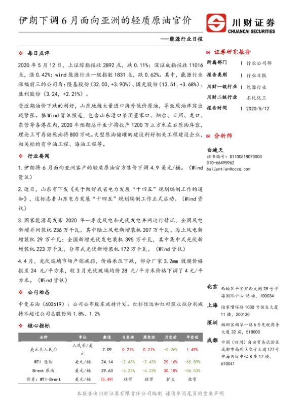 【川财证券】【20200512】能源行业日报:伊朗下调6月面向亚洲的轻质原油官价-3页 证券期货研究报告